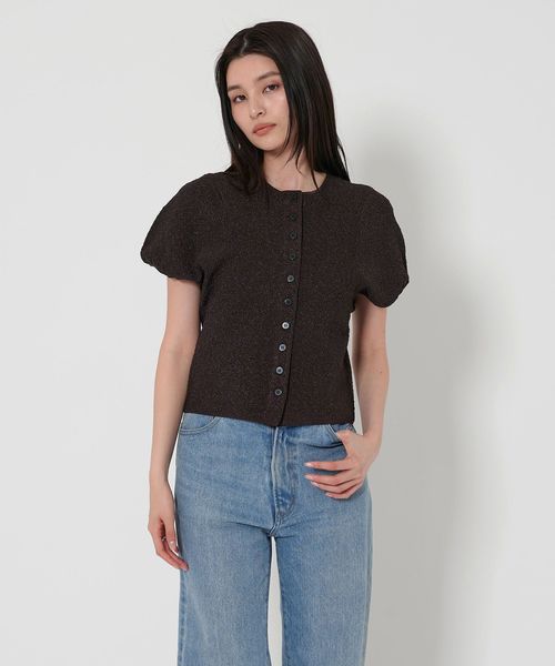 ラメをMIXした編み地で作るパフスリーブのフォルムがポイントのカーディガン。