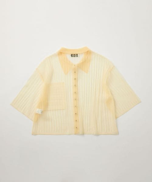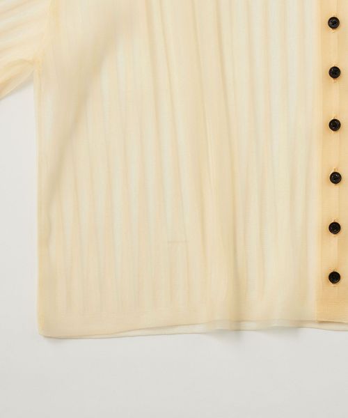 夏らしいラフな雰囲気でありながらも、シアー感と小さめなボタンをたくさん並べてつけているのがフェミニンに着られるポイント。