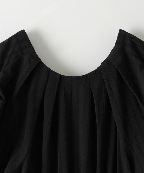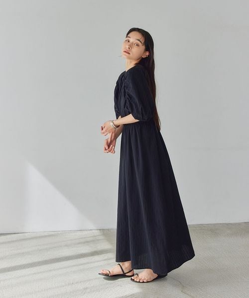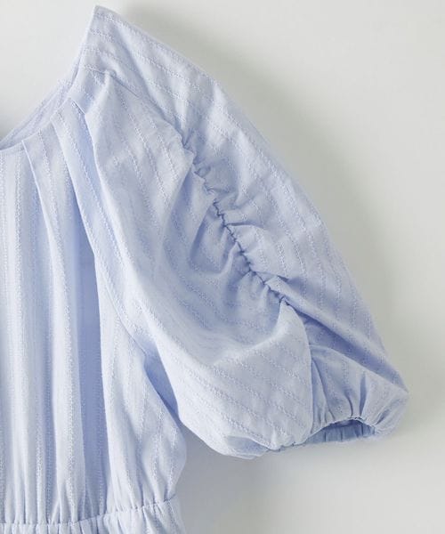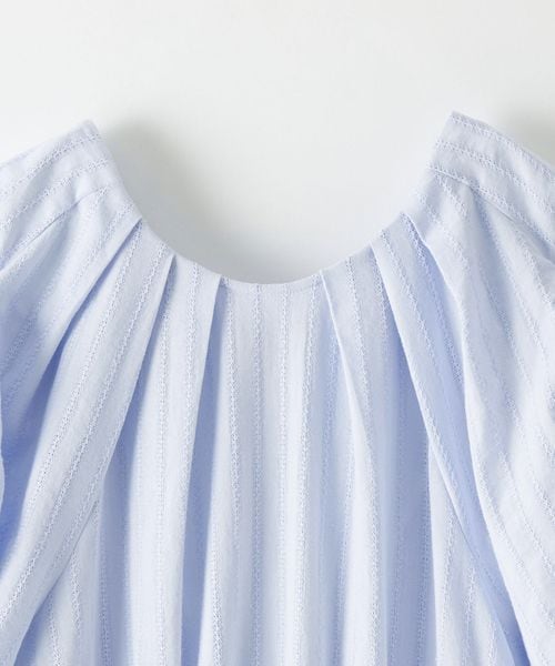 トップス部分は袖まわりにパフっとボリュームを効かせ、ネックに施したタックが顔周りを華やかに。
