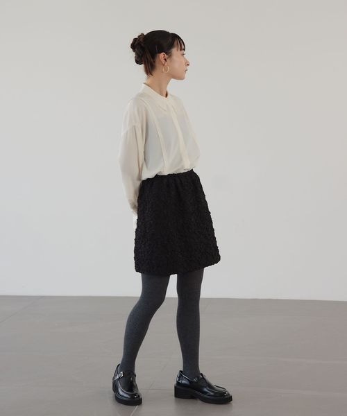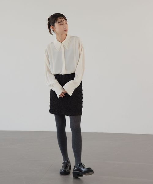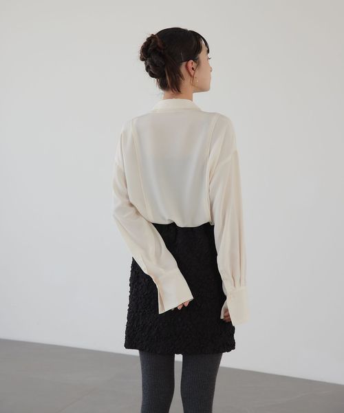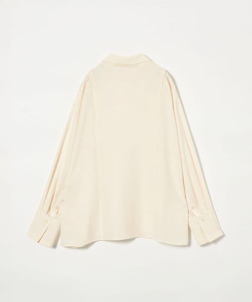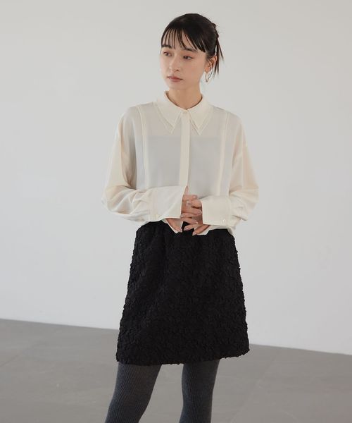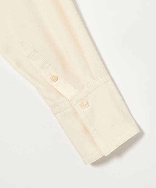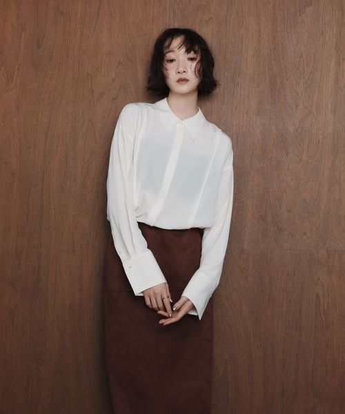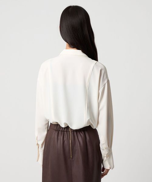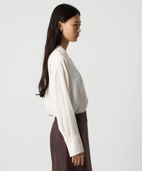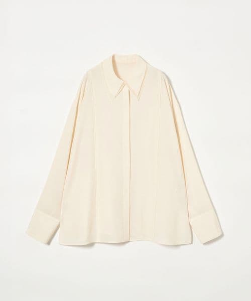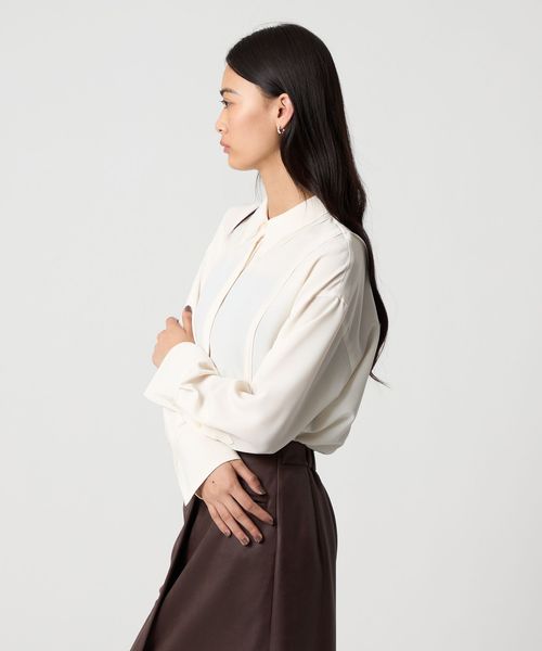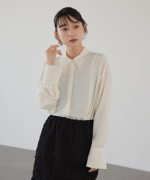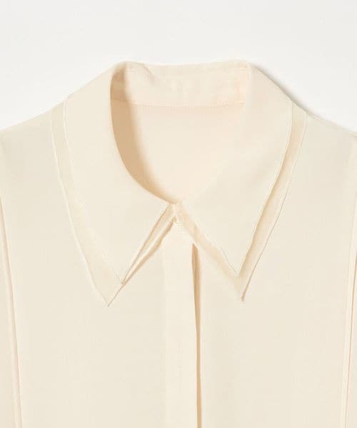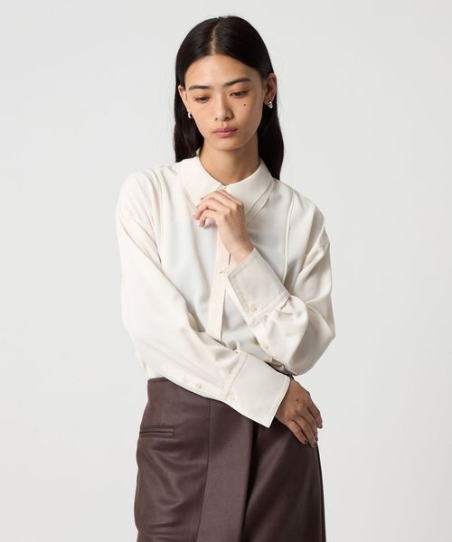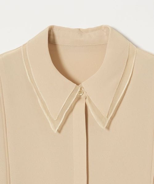 繊細な素材と重なった襟のバランスがフェミニンに着られるシャツ。