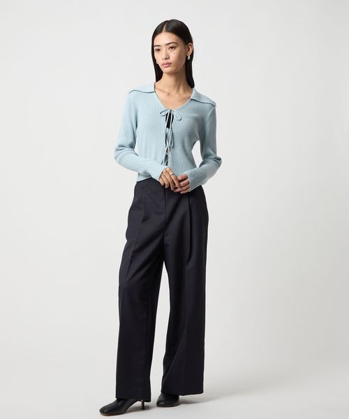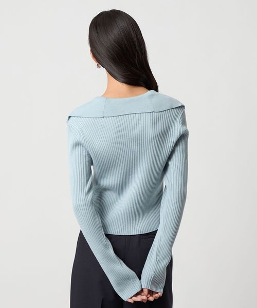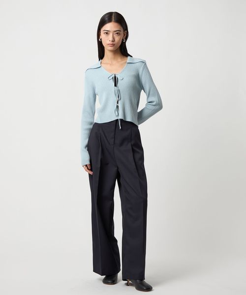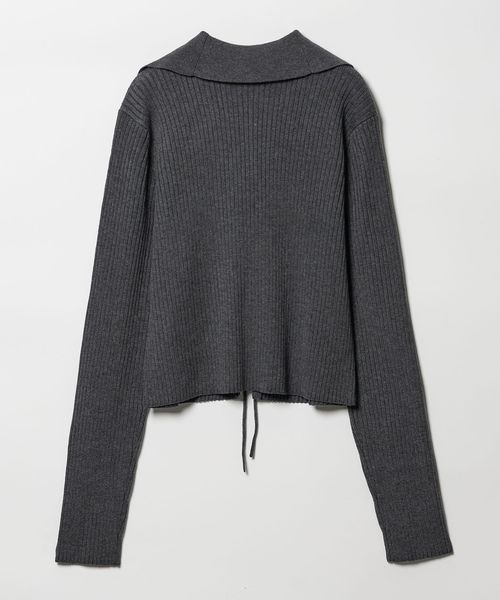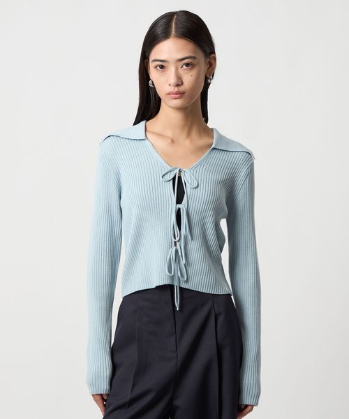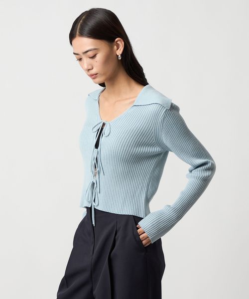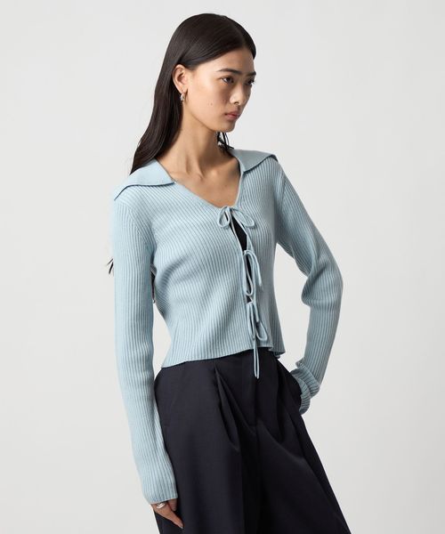 大きめの襟とフロントリボンが着映えするニット。