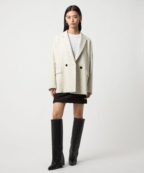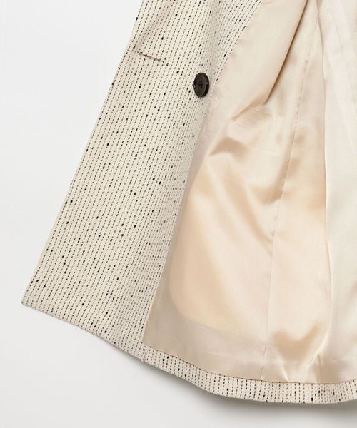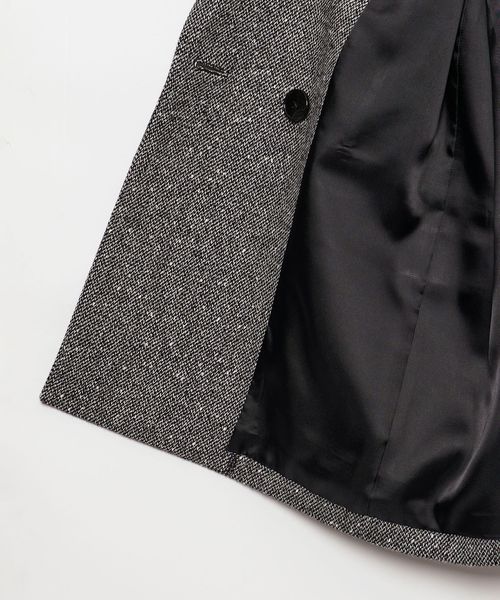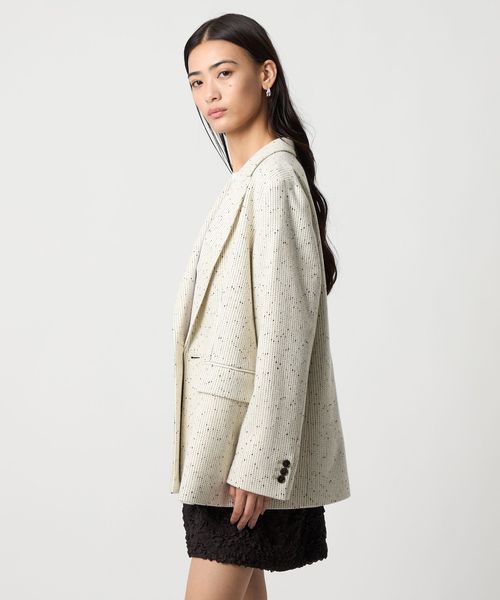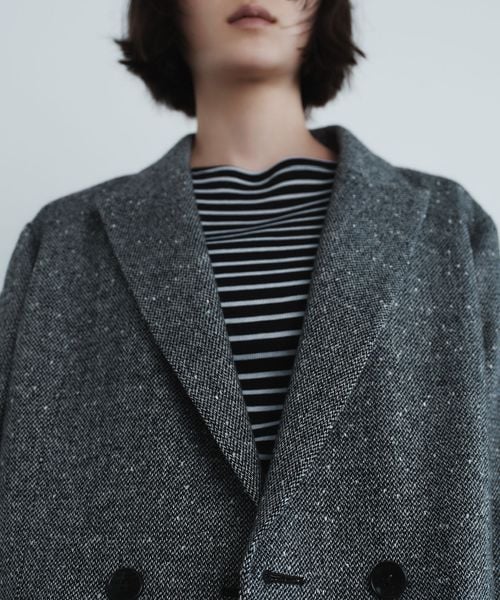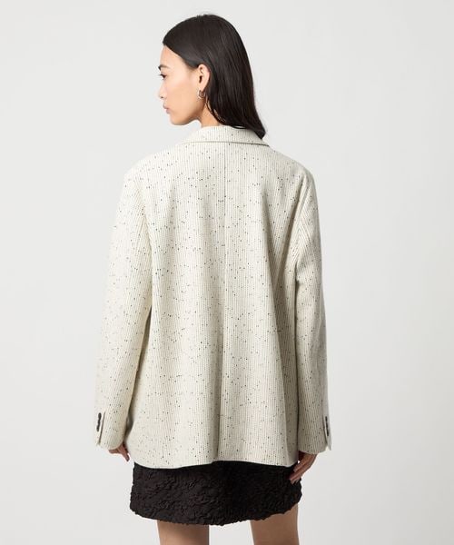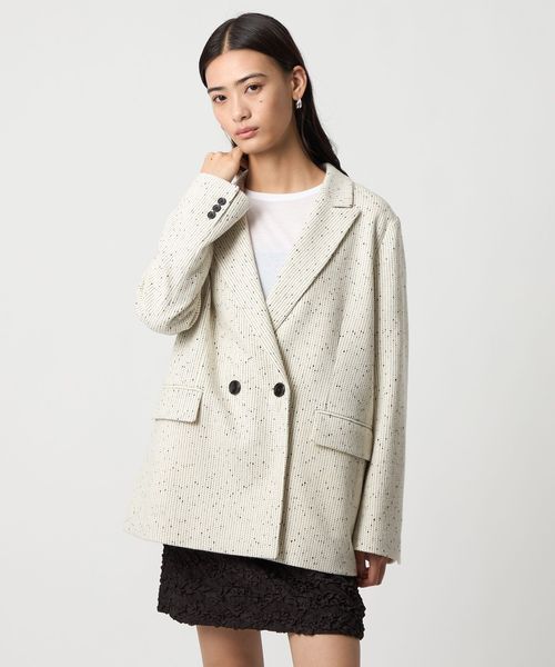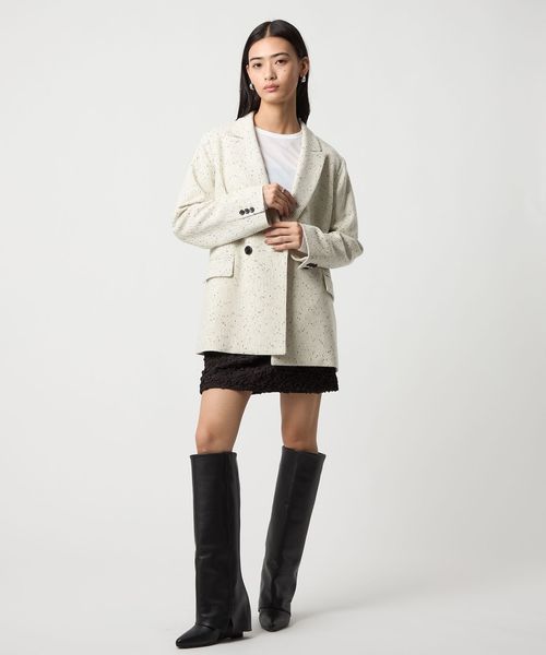 今シーズン一押しのツイードライク素材のジャケットは、ピークドラペルにダブルのフロント仕様でメンズライクなフォルムに。