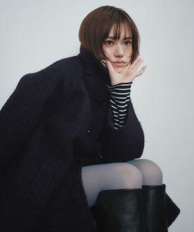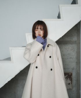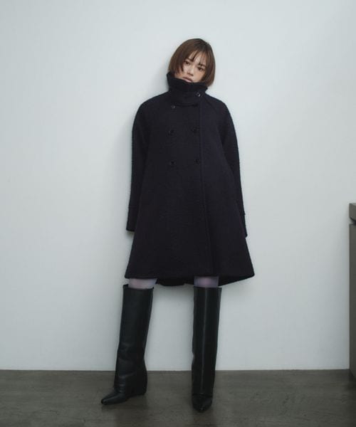 カーリーな素材感に、フロントのダブルボタンのデザインが華やかな印象。