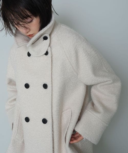 カーリーな素材感に、フロントのダブルボタンのデザインが華やかな印象。