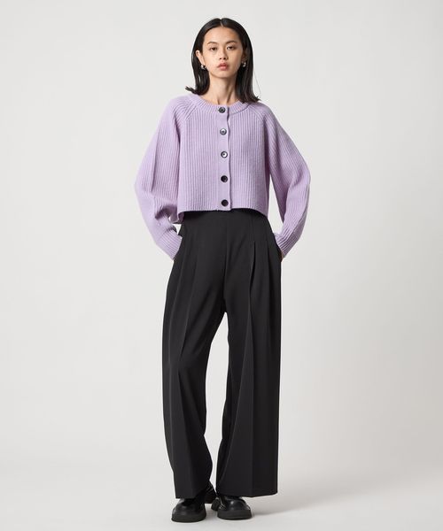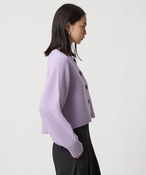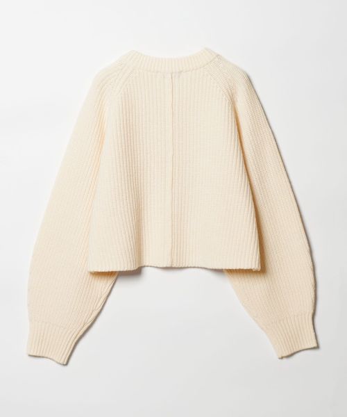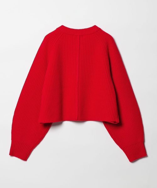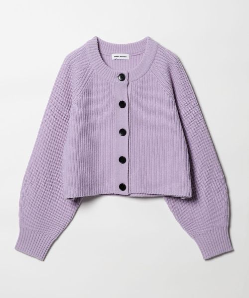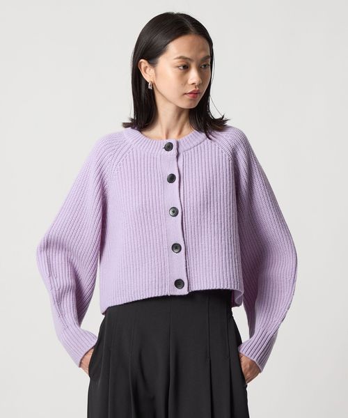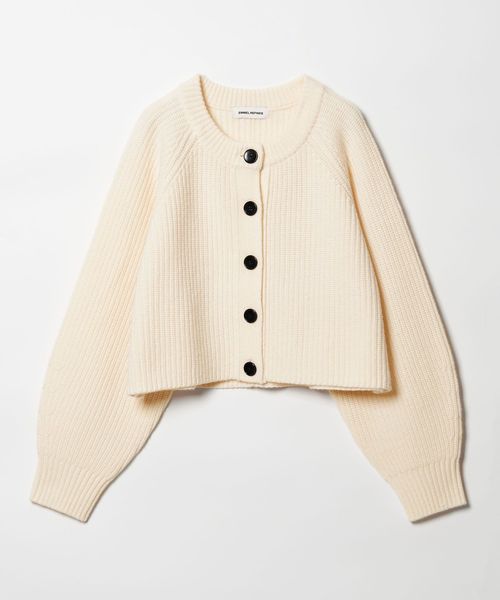 フロントの大ぶりのボタンがポイントになった、コンパクトな丈感とボリュームのある袖のフォルムが特徴のカーディガン。