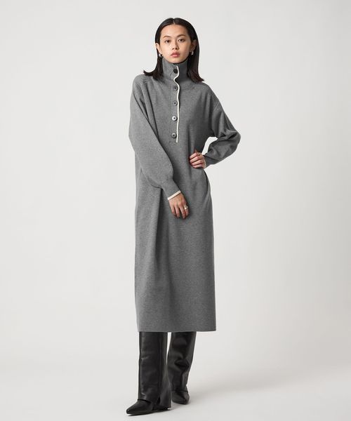 配色ラインとボタン使いがポイントのニットワンピース