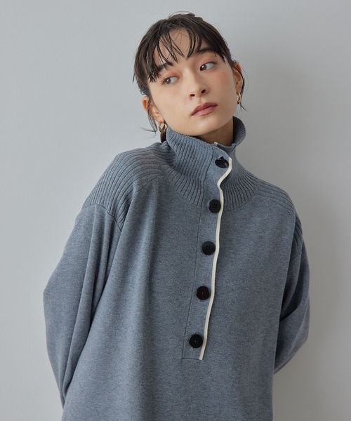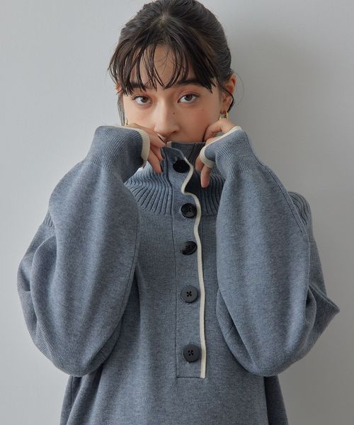タートルネックでの着用はもちろん、ボタンを開けて着用しても大きめの襟のフォルムがかわいい1枚。