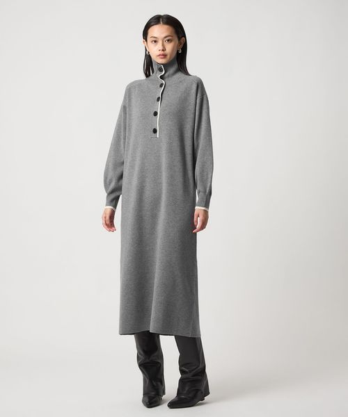 配色ラインとボタン使いがポイントのニットワンピース