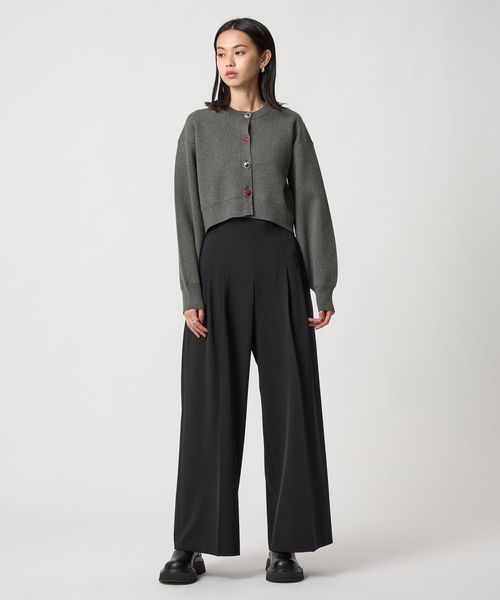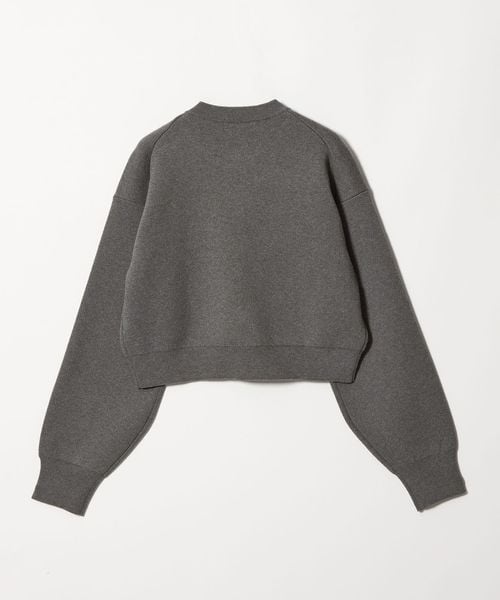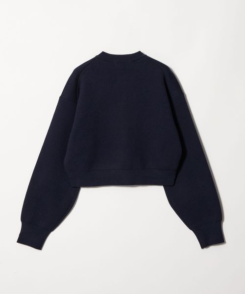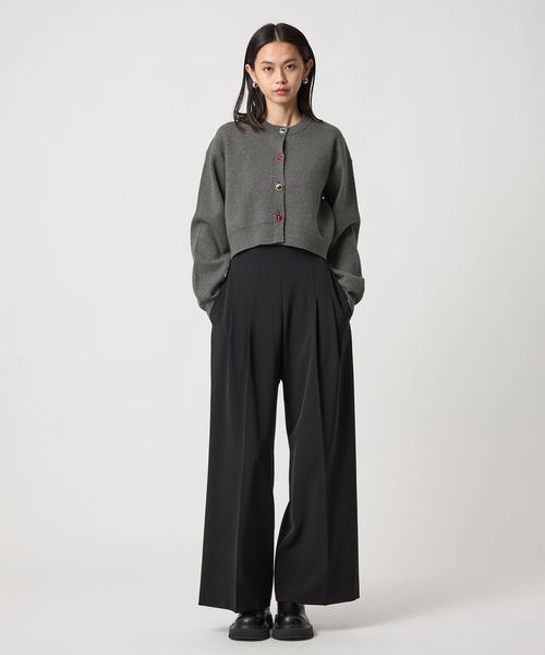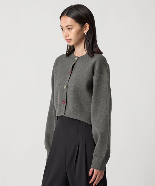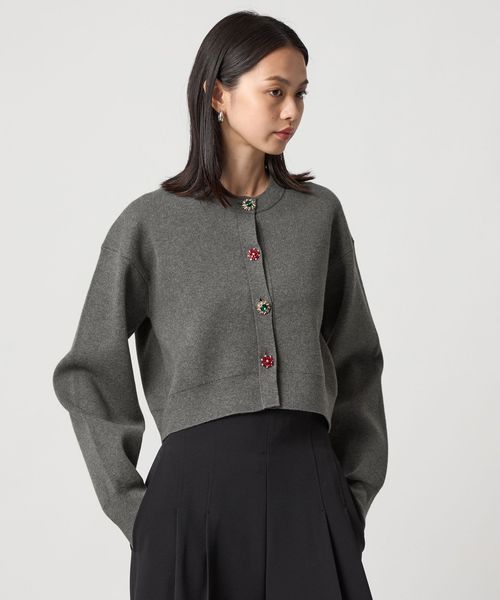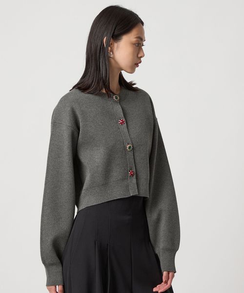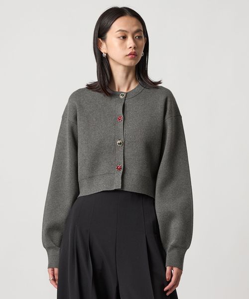 スウェットライクな肉感の編地で作るでポコッとしたフォルムのミニカーディガン。華やかなビジューボタンがポイント。