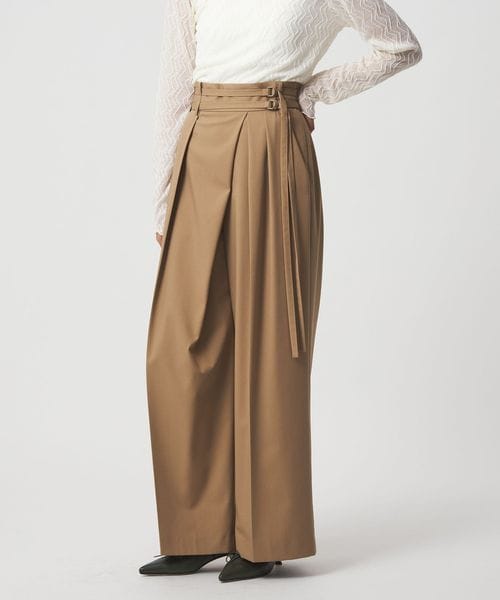 揺れ感のある素材で作るラップライクデザインがフェミニンモードな印象のワイドパンツ。