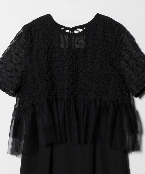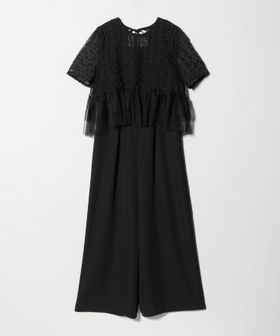 花柄刺しゅうを施したシフォンオーガンジーにティアードチュールを重ねたトップスデザインが目を惹くオールインワン。