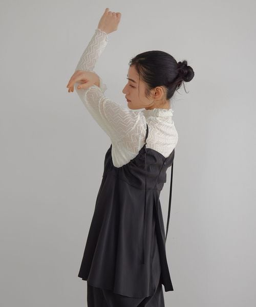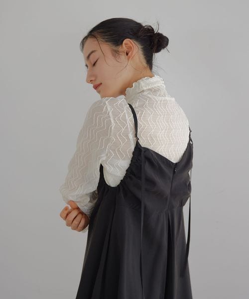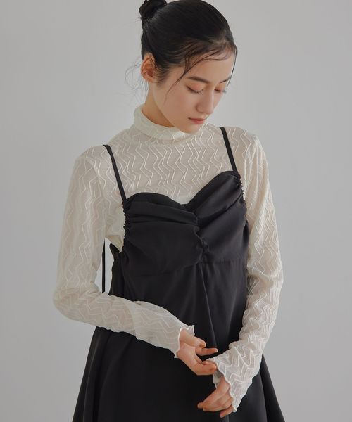 胸元のギャザーディティールとトップス部分の裾が軽やかに揺れるフェミニンなデザイン。