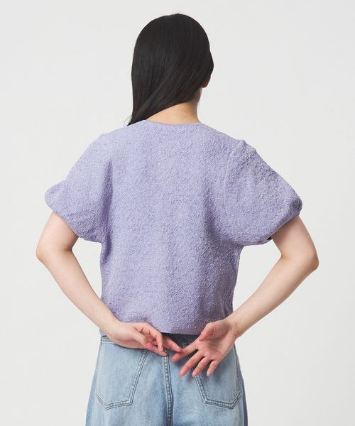 もちっとしたラメ混の編み地で作るパフ袖のフォルムが特徴的なトップス。