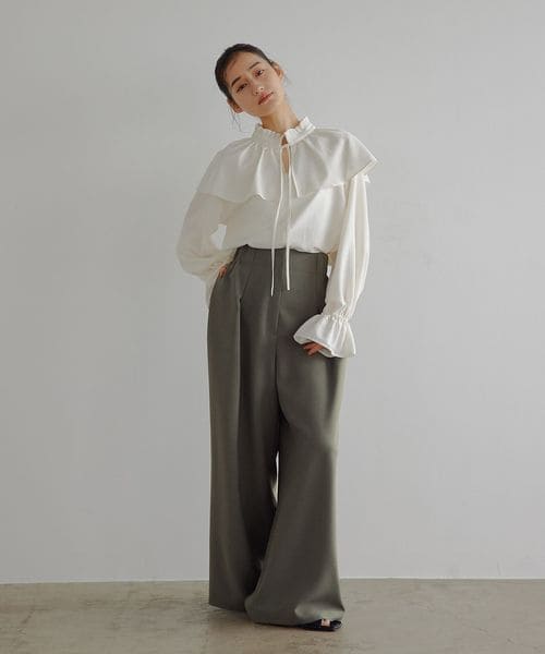 ブラウスやニットをインしても決まるシルエットなので、スタイリングの幅が広いデザイン。