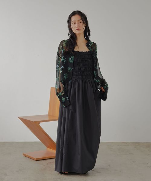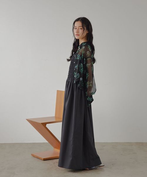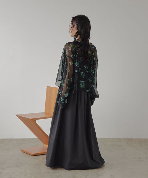 シアーなシフォン生地にリーフとフラワーモチーフをプリントしました。