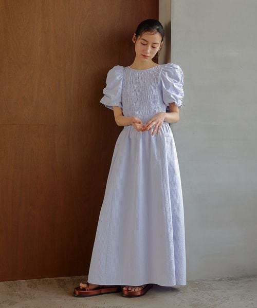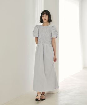 爽やかなマルチストライプに身頃にたっぷりシャーリングギャザーを寄せ、パフっとしたショート丈の袖もポイントになる1枚で着映えするワンピース。