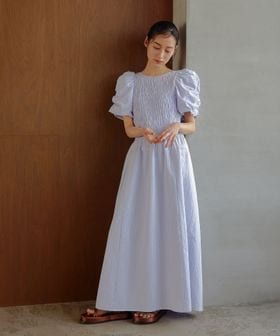シャーリングギャザーとパフスリーブがポイントの1枚着映えワンピース