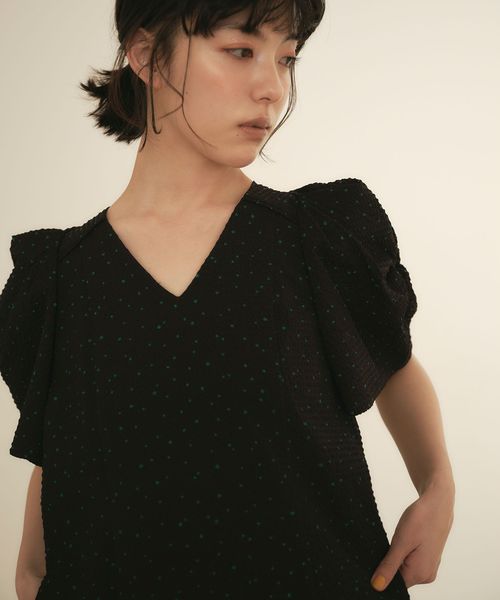 立体的なタックを取ったパフスリーブが魅力のフェミニンなドットワンピース。
