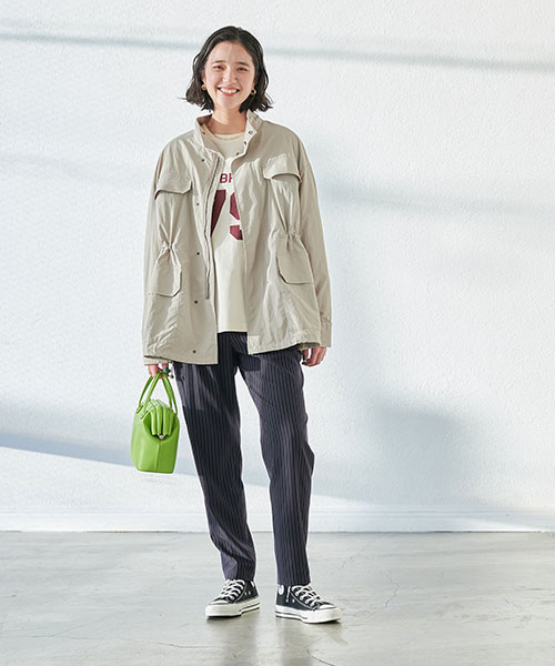 カジュアルな印象のアウターながらも、微光沢感のある素材でキレイめなシーンにも。