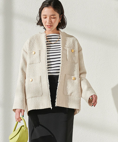 <Oggiコラボ>[ size SHORT あり ]ツイード ノーカラー ジャケット ショート 36221620190