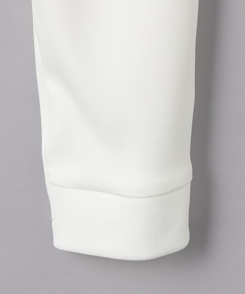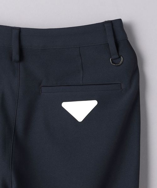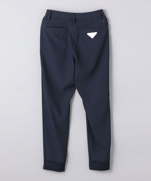 裾部分を前からは通常のスラックス仕様、後ろはリブ仕様にしたハーフジョガーパンツ。