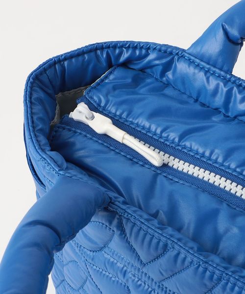 全面にメタルTのキルトパターンを施した鮮やかなロイヤルブルーのラウンドトートバッグ。