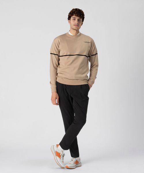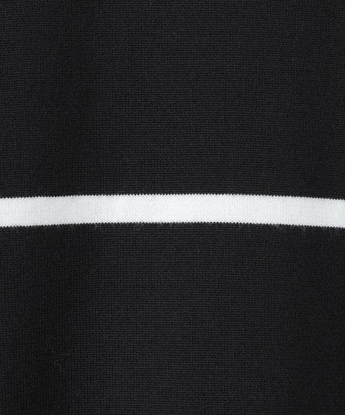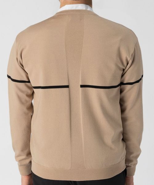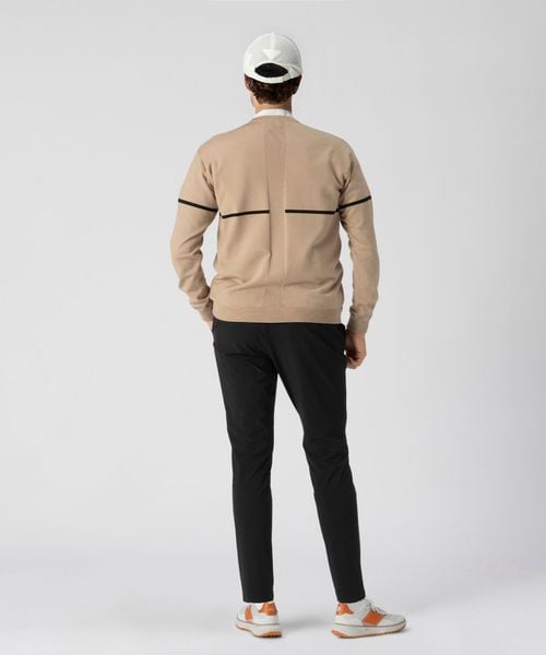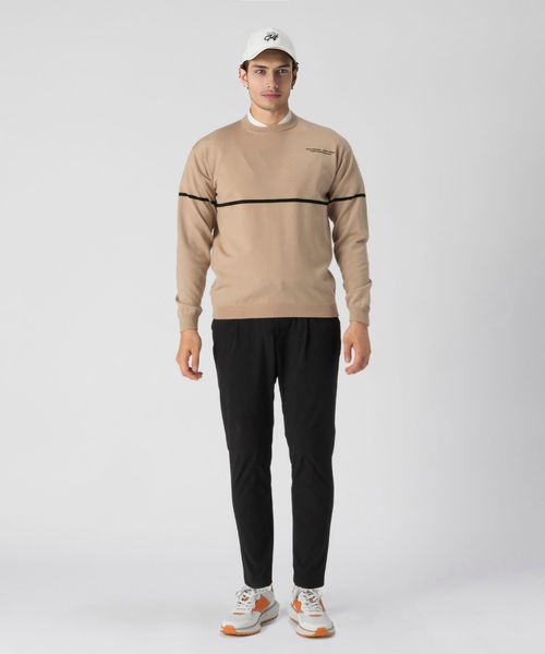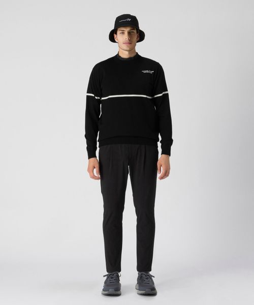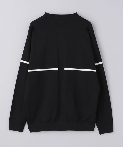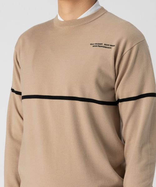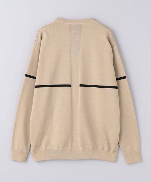 袖から胸にかけてのライン編みと、背面中心の切り替えがデザインポイントのクルーネックニット。