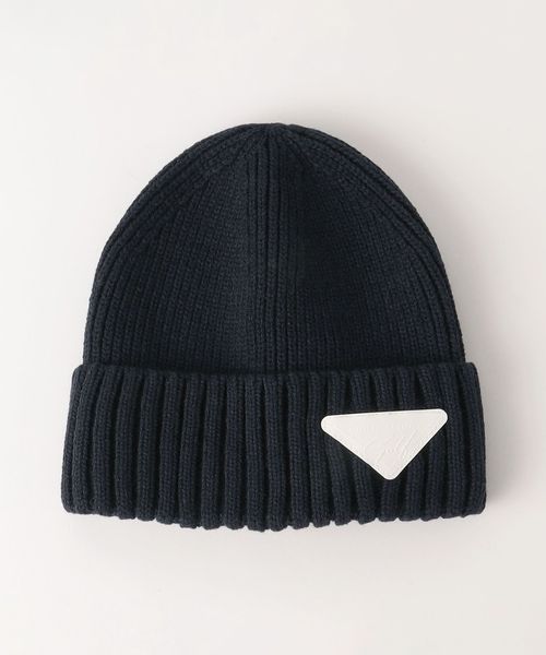 三角のブランドロゴワッペンを斜め前面に配したニットキャップ。