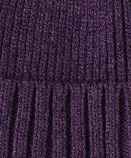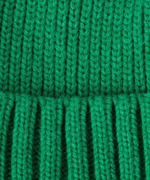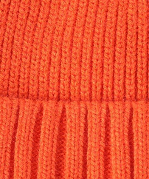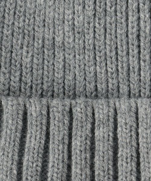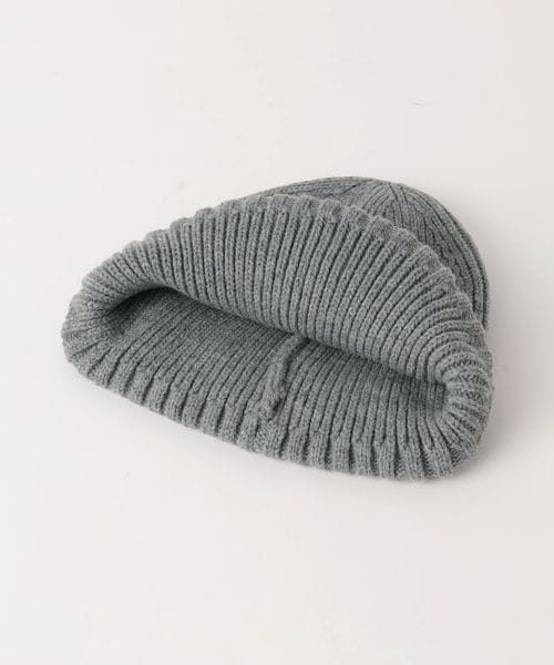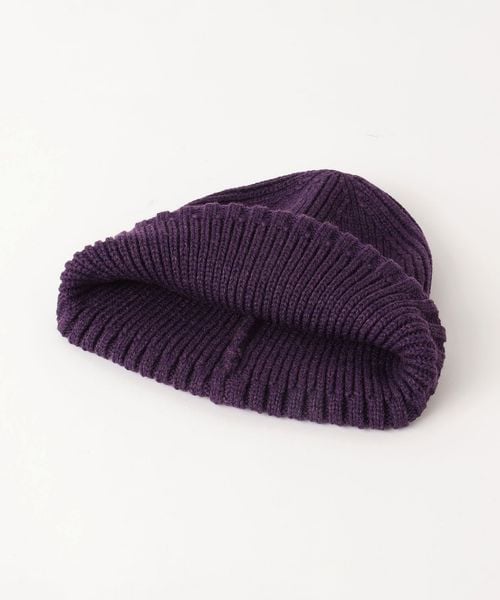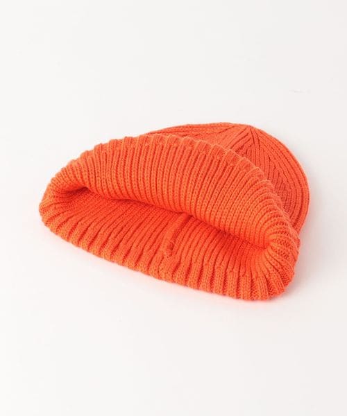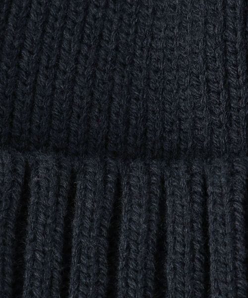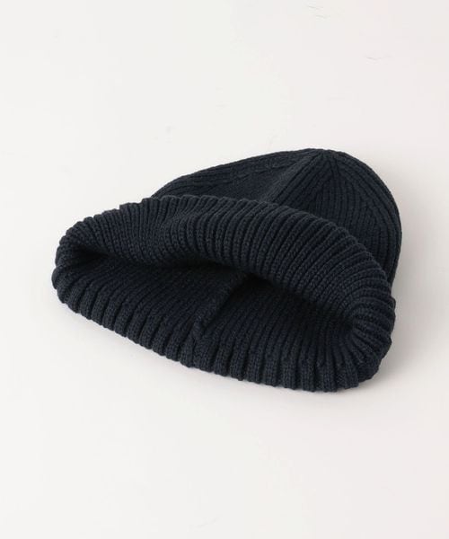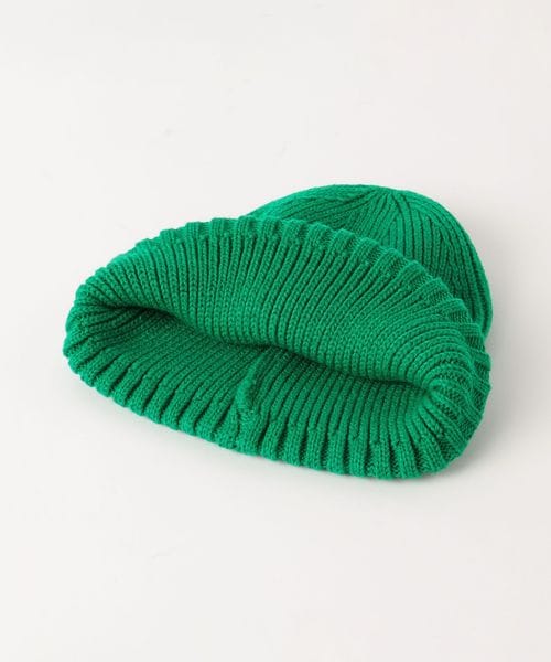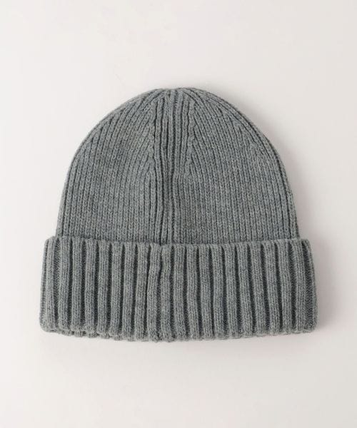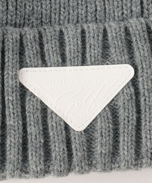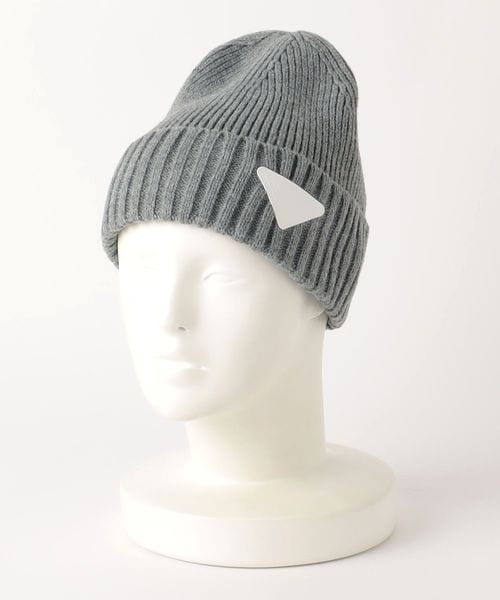 三角のブランドロゴワッペンを斜め前面に配したニットキャップ。