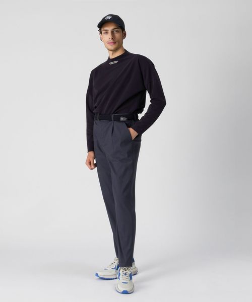 1プリーツのゆとりのある腰回りから、裾にかけて緩やかなテーパードシルエットのパンツ。