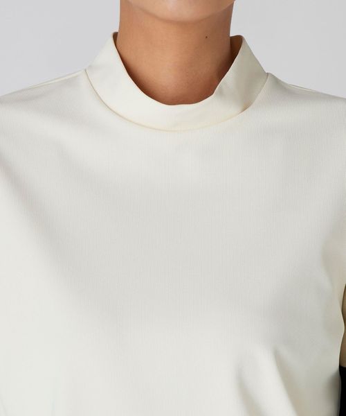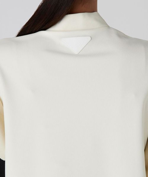 身頃と袖部分で異なる素材を組み合わせたハイブリッド モックネックニット。