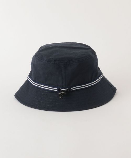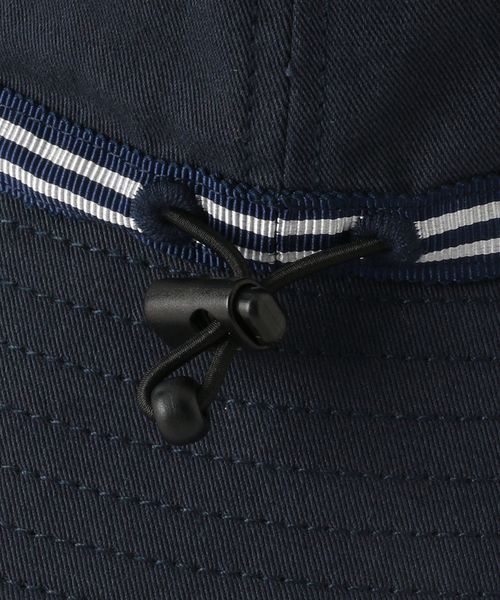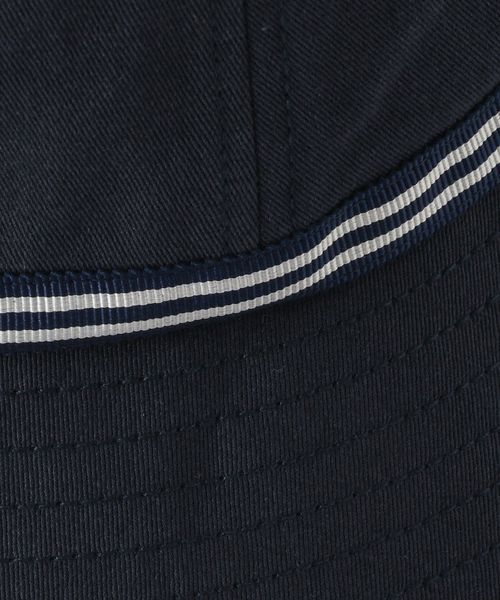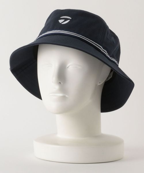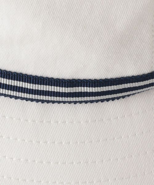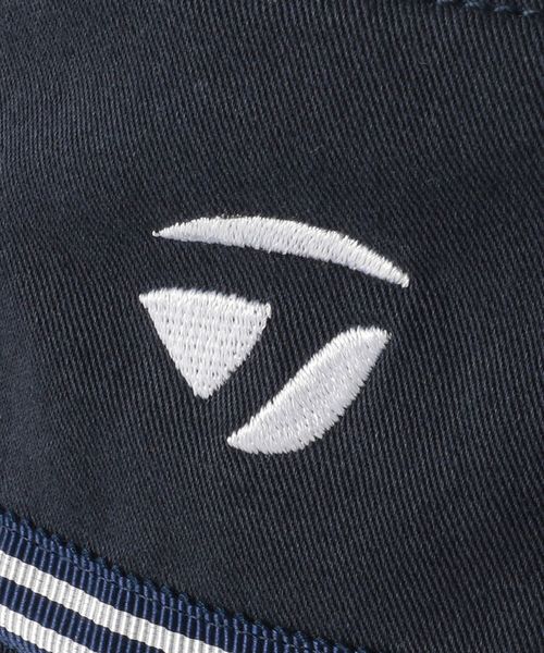 フロント正面に小さくメタルTロゴと、ストライプ柄のグログランテープを施したバケットハット。