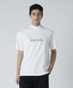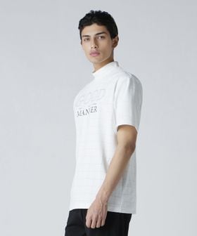 フロントに大きくブランドスローガンがプリントされた大胆なデザインのモックネックシャツ。