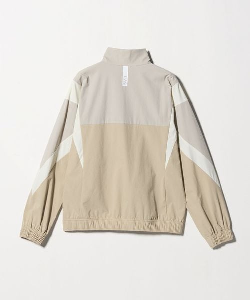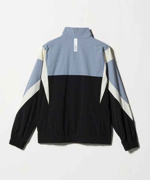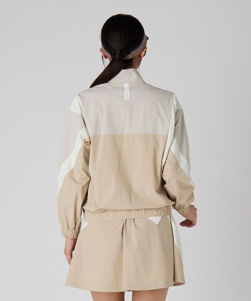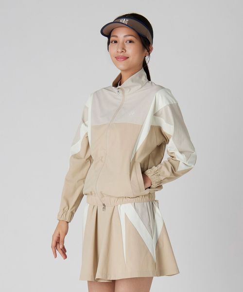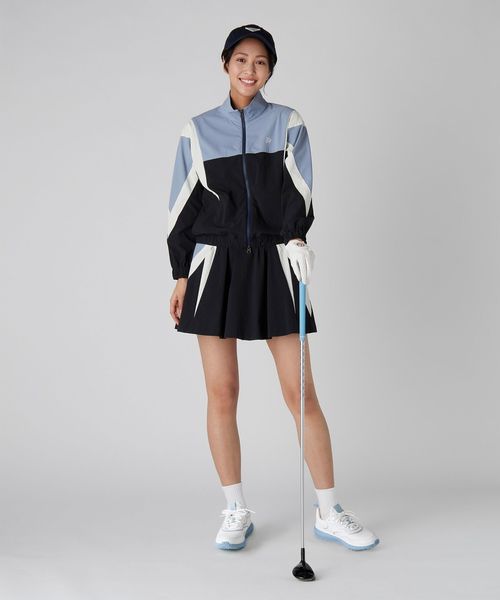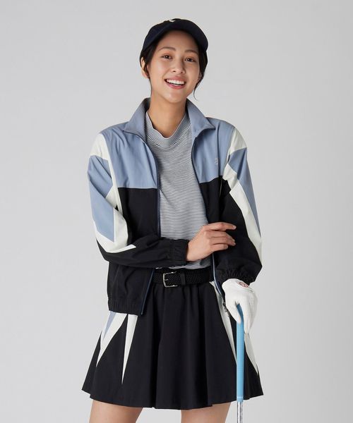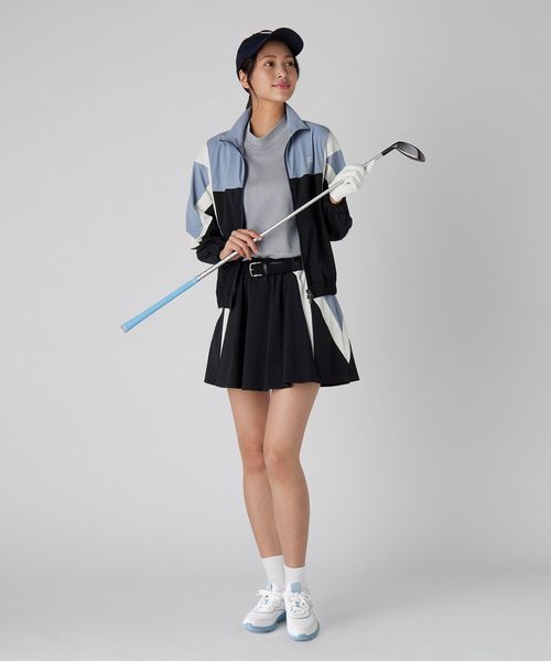 同素材のスカートに合わせた大胆な切り替えパターンが、エッジィな印象を与えつつも、程よくスポーティなデザインです。