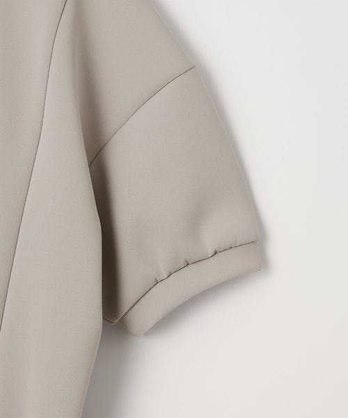 台形シルエットのスカート部分と、ふんわりとしたパフスリーブ調の半袖が女性らしいルーズなシルエットを描き、モダンな印象に仕上げています。