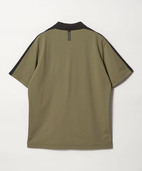 両肩の配色ライン切り替えと衿配色がスポーティな印象を演出し、前立て下にはさりげなくブランドロゴを配置。
