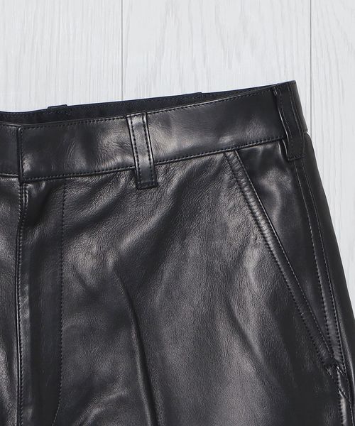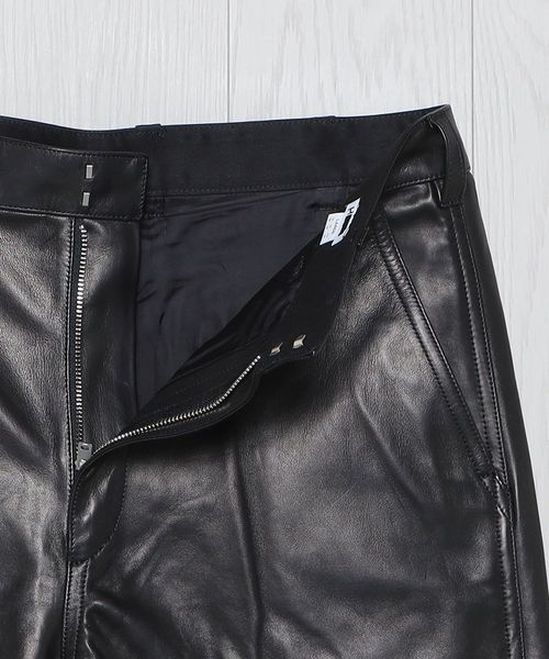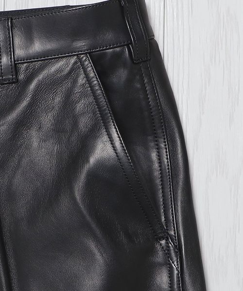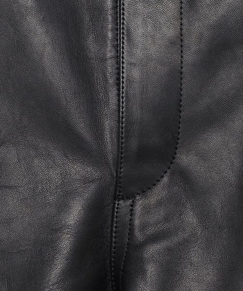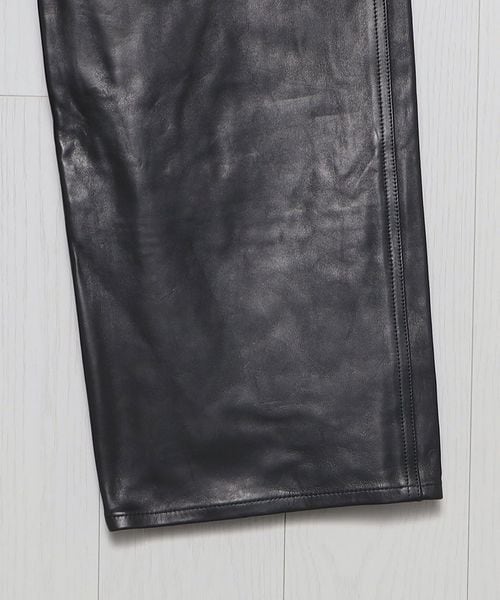 皮本来の表情を活かした、セミベジタブル鞣しのシープレザーパンツです。靴用の皮を仕上げるに時に行う鞣し工程をすることで、独特のハリ感が出ているのもこの革の特徴の一つ。デザインは、U.S.のヴィンテージペインターパンツをベースに、ハンマーループやリベット等のディテールを削ぎ落とし、シンプルにはきやすくアレンジしました。カジュアルなアイテムを元にワイドストレートシルエットに設定し、艶っぽい印象を排除した味のある表情が魅力の一着。