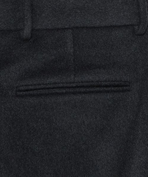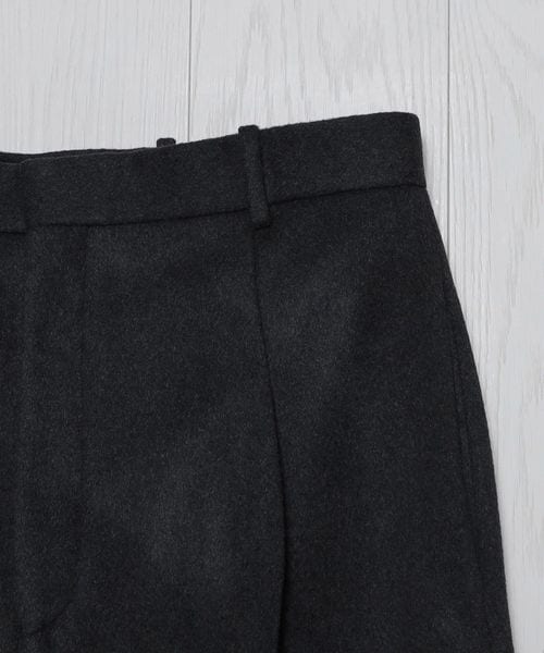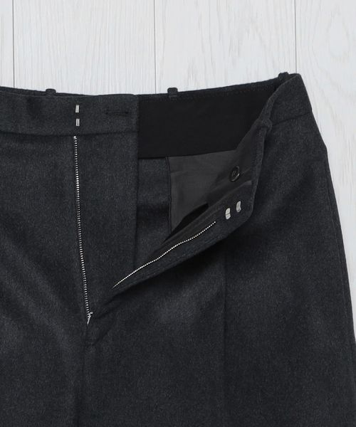 迫力のある太さが特徴の1プリーツワイドパンツです。カシミヤ混の上質なフラノビーバーを表地に使用し、原料のやわらかさと適度な光沢が特徴です。存在感のあるシルエットは、トレンドのショートアウターとも相性がよく、贅沢な生地と相まってシンプルな装いもクラス感漂うスタイルに導きます。