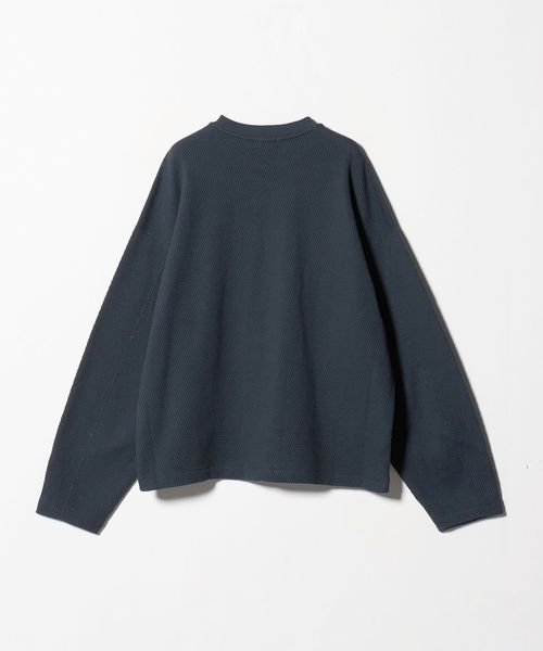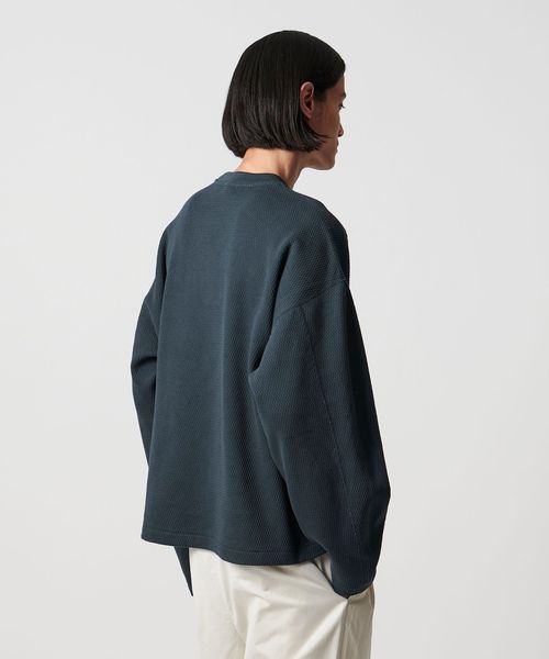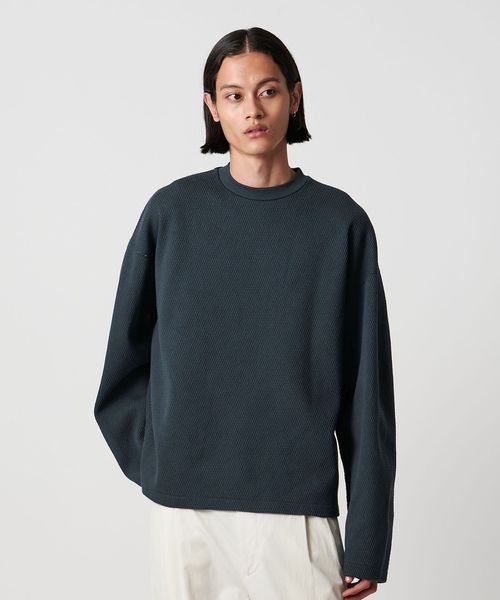立体感のある大ぶりなサーマルボディが特徴のロングスリーブカットソーです。シルケット加工を施し、迫力がありながらもきれいめな表情に仕上げたラグジュアリーな素材感が魅力です。すっきりとさせたセミクロップド丈に加え、肘部分のパターンに分量を出し、わずかに肘部分で膨らみが出る立体的なシルエット。生地とフォルムの絶妙な調和が、モダンなカジュアルスタイルに導くおすすめの一着。