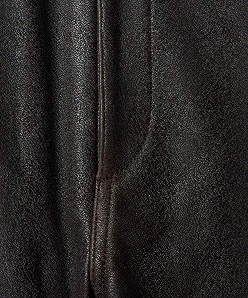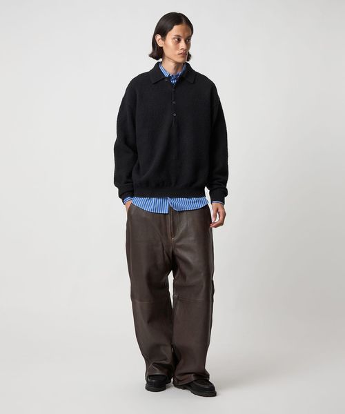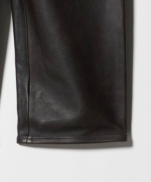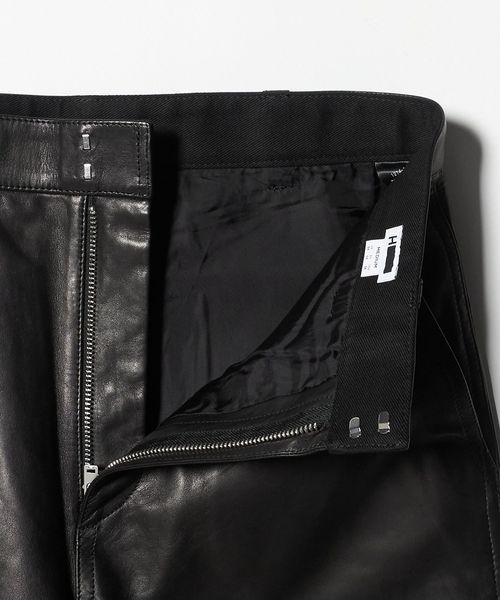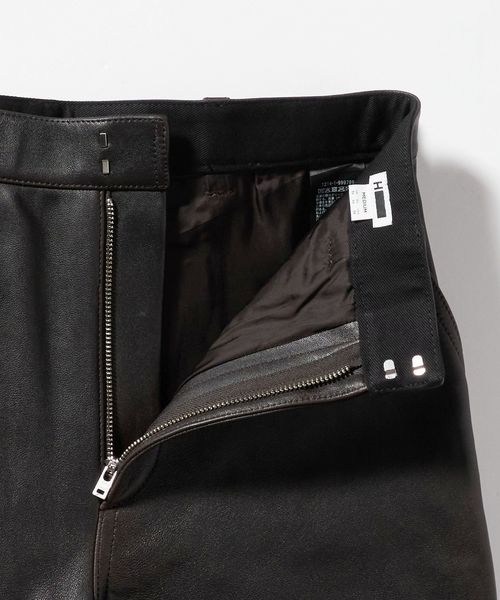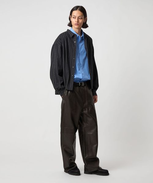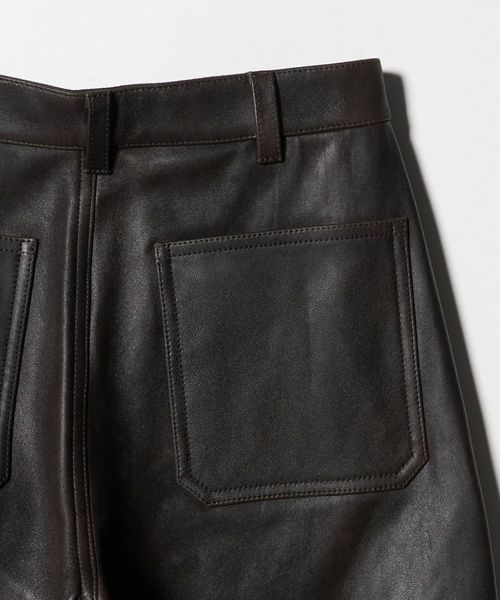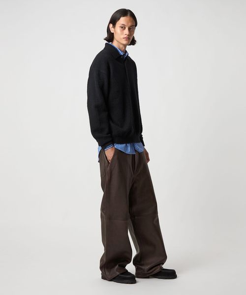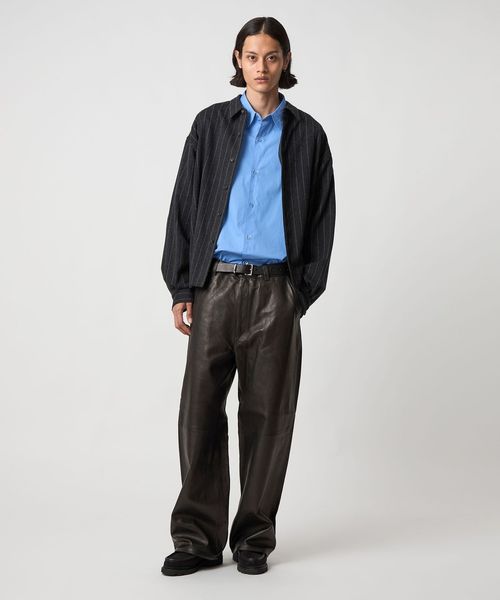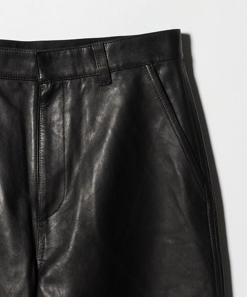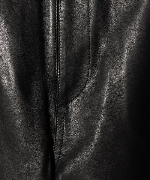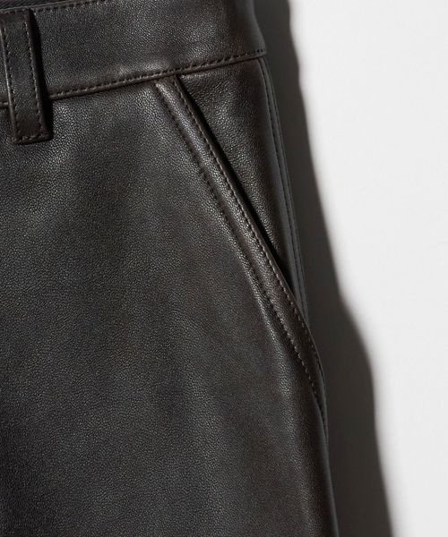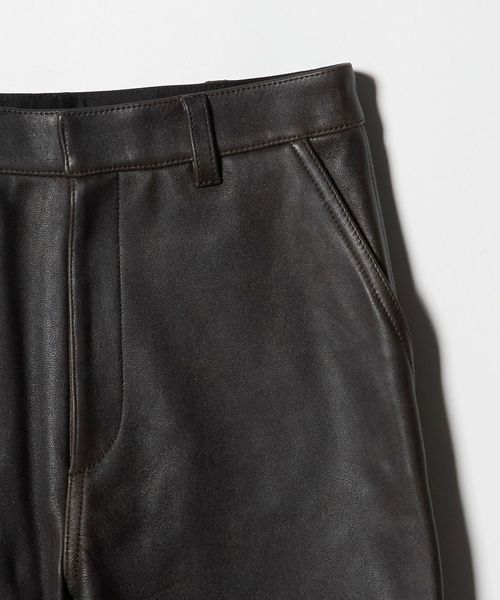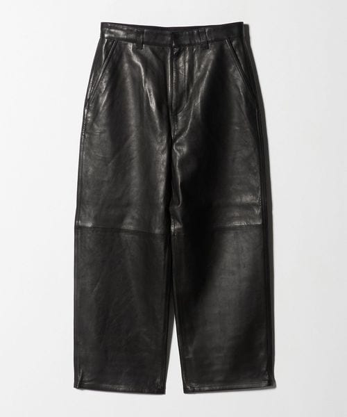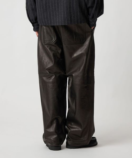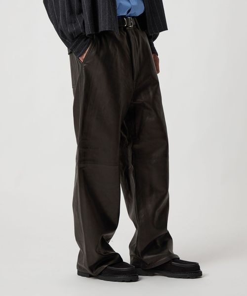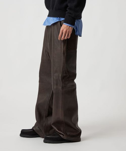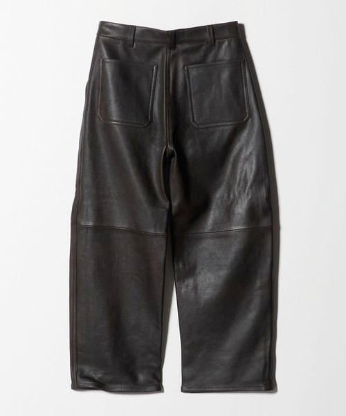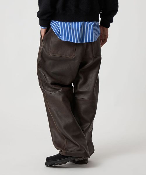 U.S.ヴィンテージのペインターパンツをベースに現代的な雰囲気で仕上げたパンツです。ハンマーループやリベットなどのディテールをそぎ落とし、シンプルではきやすいデザインにアレンジ。形はワイドシルエットへと落とし込み、レザーパンツ特有の艶っぽい印象を排除ししました。ブラックは、天然の渋で鞣し、染色も水染めで仕上げることによって皮本来の表情を活かしました。靴用の皮を仕上げるときに行う鞣し工程をすることで、独特のハリ感が出ているのも特徴です。ダークブラウンは、上質なトルコ産の皮をトルコタンナーにて鞣しから染色まで一貫して製作。セミベジタブル鞣しの独特のシボ感と光沢が魅力です。ブラウンに地染めした後に表面にブラック顔料をのせ、洗いでムラに落としたヴィンテージのような味わいを表現しました。素材を活かしたミニマルなフィーリングがほどよい抜け感を与え、自由で飾らないアーバンスタイルへと導きます。