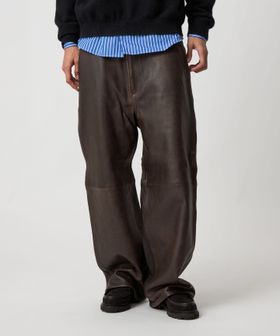 U.S.ヴィンテージのペインターパンツをベースに現代的な雰囲気で仕上げたパンツです。ハンマーループやリベットなどのディテールをそぎ落とし、シンプルではきやすいデザインにアレンジ。形はワイドシルエットへと落とし込み、レザーパンツ特有の艶っぽい印象を排除ししました。ブラックは、天然の渋で鞣し、染色も水染めで仕上げることによって皮本来の表情を活かしました。靴用の皮を仕上げるときに行う鞣し工程をすることで、独特のハリ感が出ているのも特徴です。ダークブラウンは、上質なトルコ産の皮をトルコタンナーにて鞣しから染色まで一貫して製作。セミベジタブル鞣しの独特のシボ感と光沢が魅力です。ブラウンに地染めした後に表面にブラック顔料をのせ、洗いでムラに落としたヴィンテージのような味わいを表現しました。素材を活かしたミニマルなフィーリングがほどよい抜け感を与え、自由で飾らないアーバンスタイルへと導きます。