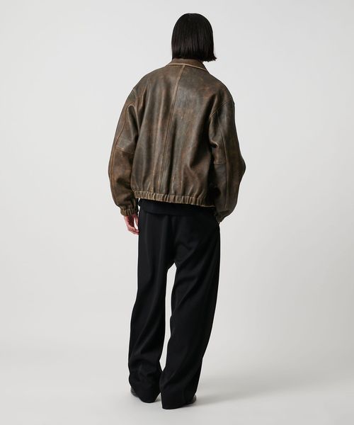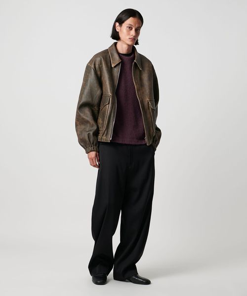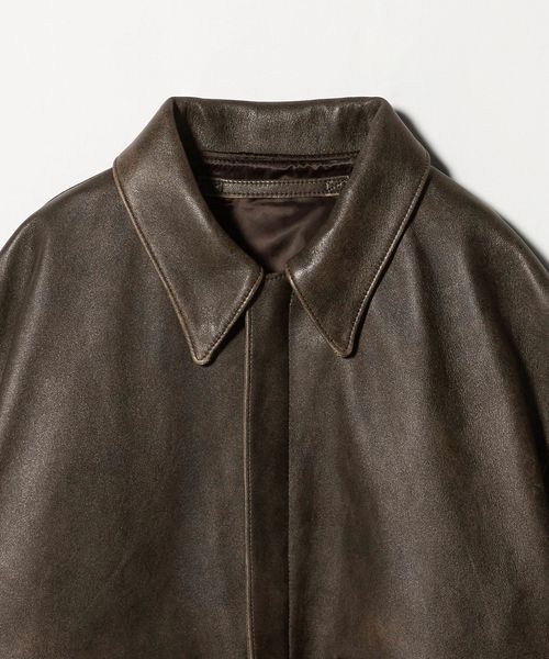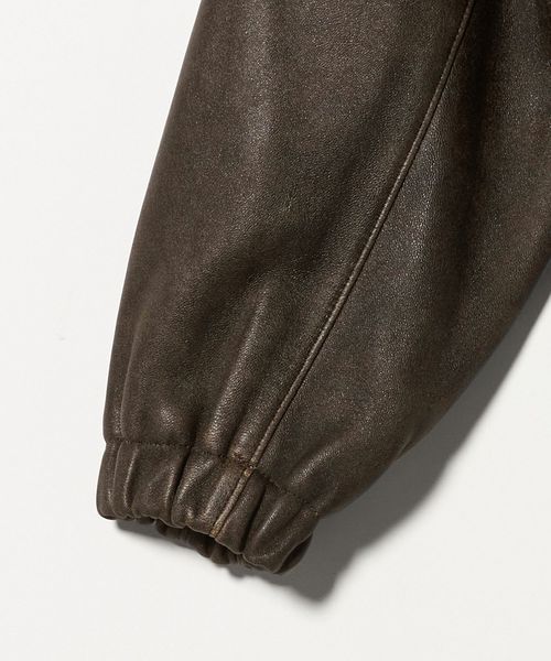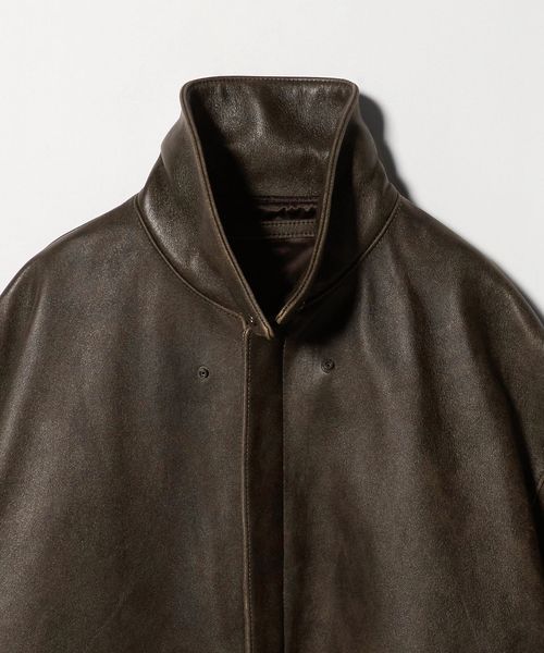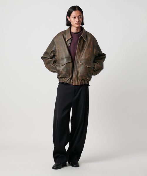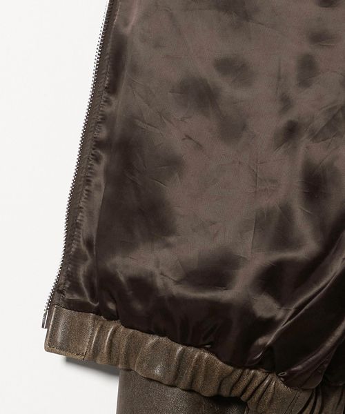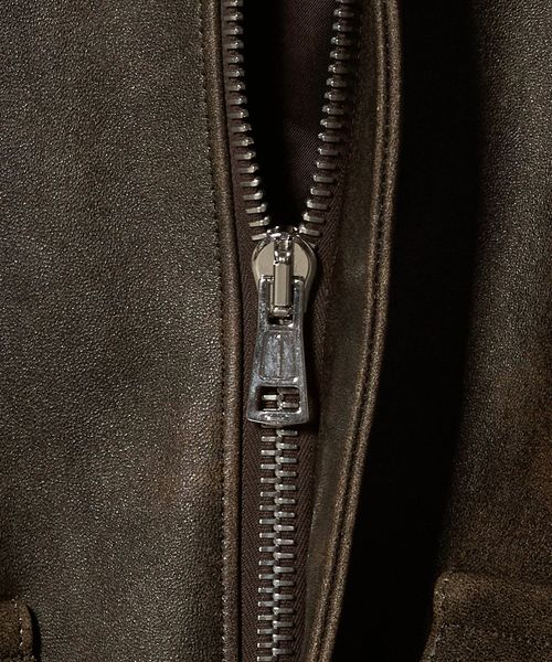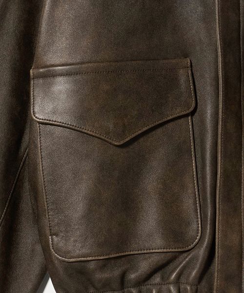 アメリカ軍のA-2フライトジャケットをベースに現代的なムードでアレンジしたレザージャケットです。上質なトルコ産の皮をトルコタンナーにて鞣しから染色まで一貫して製作。セミベジタブル鞣しの独特のシボ感と光沢が魅力です。ベージュに地染めした後に表面にブラック顔料をのせ、洗いでムラに落としたヴィンテージのような味わいを表現しました。裾と袖口のリブは共革のシャーリングリブで贅沢な仕様に仕立て、ニットリブよりもモードな印象に。味わいのある表情が高揚感を与えながら、コンパクトな襟、「RACCAGNI」社製ファスナーが上品なアクセントをプラスします。日常のワードローブに寄り添いながら、スマートなカジュアルスタイルに導く万能な一着。