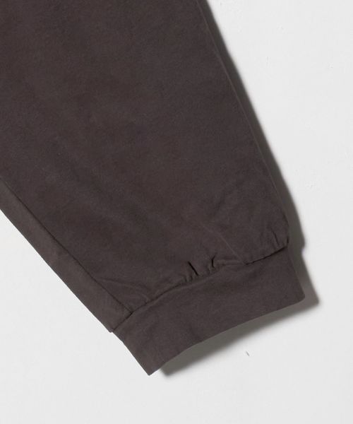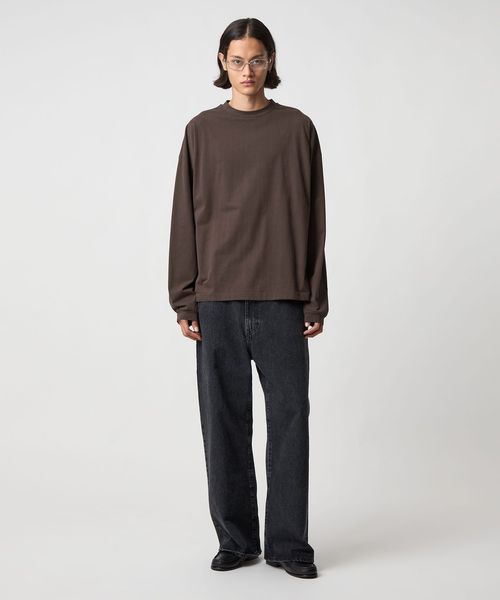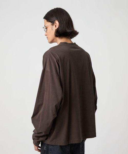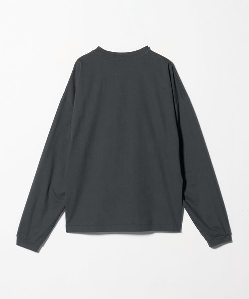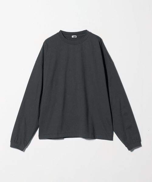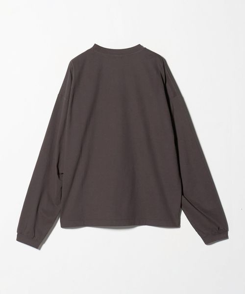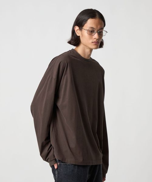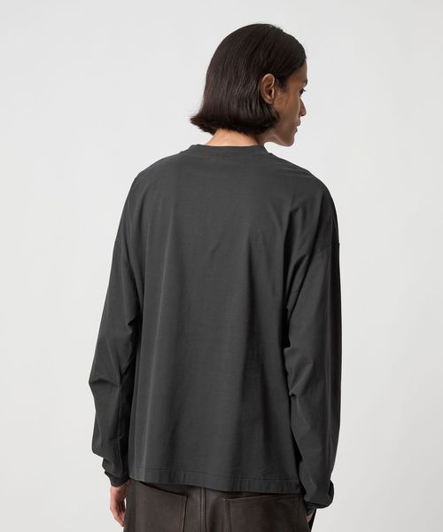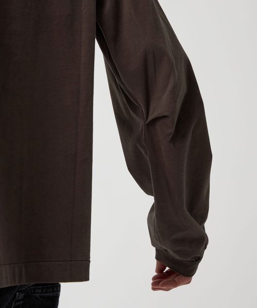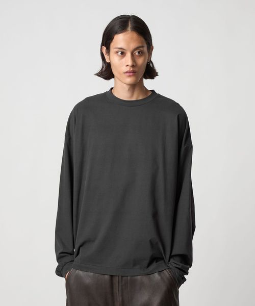 袖にタックを入れたカーブスリーブと、スエードタッチのなめらかな素材感が魅力のロングスリーブカットソーです。60番スビンコットン糸をベースに起毛加工(プラチナベール加工)を施したスペシャルファブリックを採用しています。度詰めの生地を使用し、薄手すぎない安心感のある着心地も魅力です。ボディは、ワイドな身幅に、長めのスリーブ、着丈はやや短めのレングスに設定し、タックインバランスのナチュラルなシルエットを構築。ネックはリブではなく共地で仕立てることで、クリーンで洗練された表情に仕上げました。一見シンプルなTシャツでありながらも、肘部分に施したタックで独特なシルエットが生まれ、ファッションムードを高めるアクセントになっています。