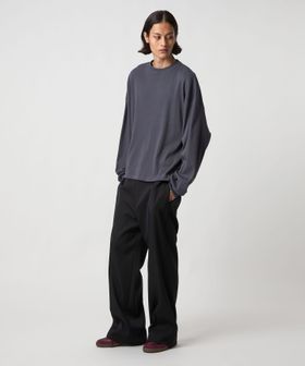 梳毛とポリエステルを交織したダブルクロス仕立てのスラックスです。ノープリーツで腰回りをすっきりとさせ、膝から裾にかけてのワイドレッグが強調されたスタイリッシュなシルエットが魅力です。表面は梳毛によりラグジュアリーな質感が感じられ、裏面はポリエステルにより、はき心地のよさにこだわりました。品がありながらも、コンフォートなバランスが日常に取り入れやすく、光沢を抑えたブラックにより、品がありながらも気負わず取り入れやすい雰囲気に。洗練されたスマートなカジュアルスタイルに導くおすすめの一着。