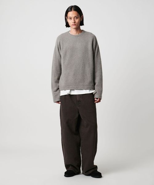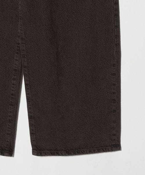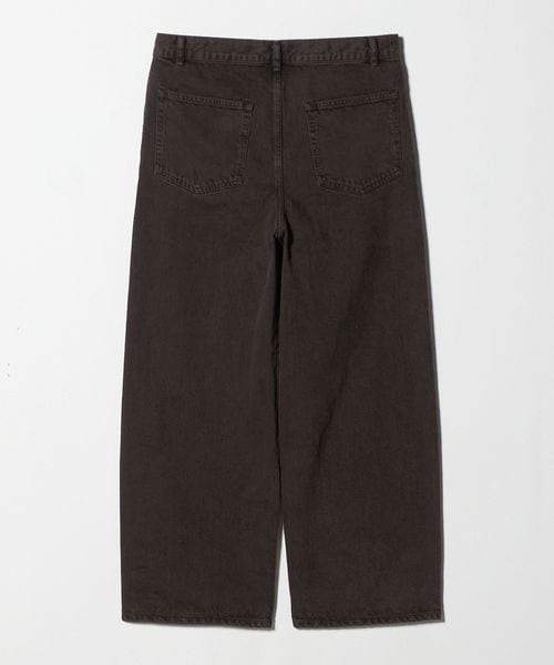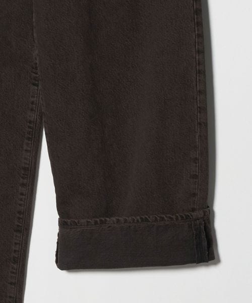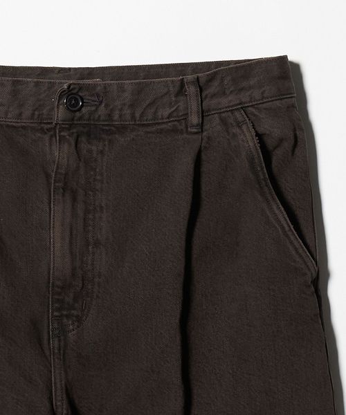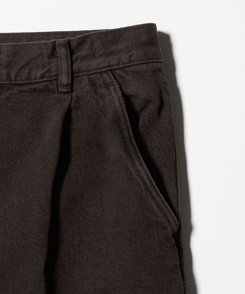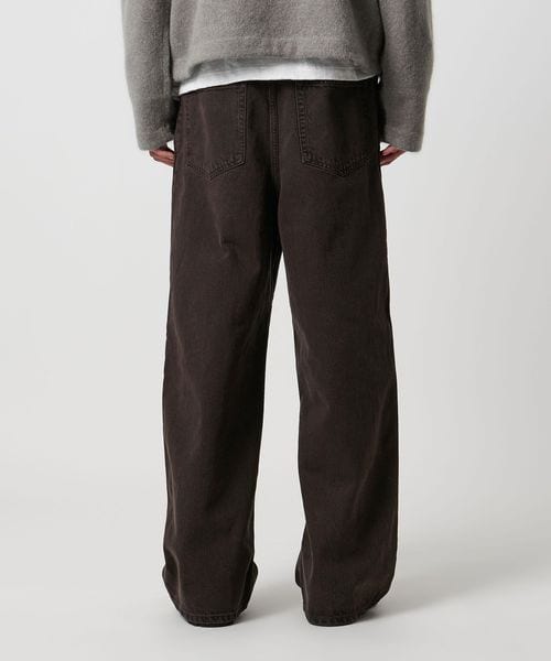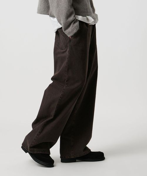 ボリューム感のあるワイドシルエットが特徴の1プリーツバギーパンツです。13.5ozの硫化染めBLACKデニムを使用し、製品加工でブリーチしてからBROWNにオーバーダイすることによって、双方の色味が混ざった陰影のある独特の表情に仕上がりました。腰回りはすっきりとさせながら、ワタリから膝にかけて大胆に広げ、裾にかけて僅かにテーパードさせることによって大人でもはきやすい絶妙なバランスに。主役にも脇役にもなる存在感で、アーバンムード漂うモダンなスタイルに導きます。