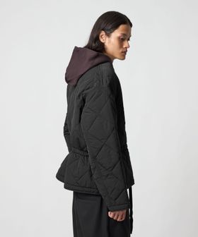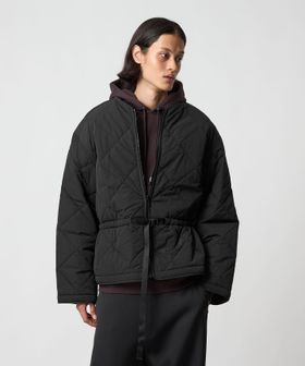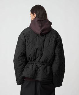 U.S.ミリタリーライナーをベースにデザインしたキルティングライナージャケットです。高級合繊メーカー「LIMONTA EAST」社の40デニールのナイロンワッシャーを採用し、贅沢に両面表地を使用しています。ワッシャー加工により肌離れがよく、軽やかで心地よい袖通しが魅力の一着。横糸に黒の糸を使用することで、ダークブラウンはシャンブレーの陰影のある豊かな色に仕上がっています。オーバーサイズで中わたも適度なボリュームがあり、裾と袖口を絞ることで、バルーンシルエットにもアレンジが可能です。襟ぐりは狭めの設定、フロントファスナーのエレメントの艶がラグジュアリーな魅力を引き上げています。