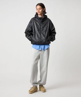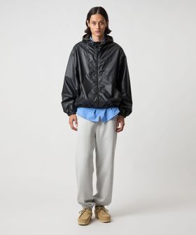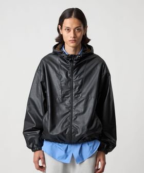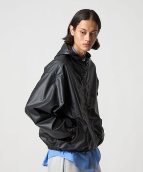 90年代のアノラックジャケットをベースに合成皮革で仕立てたジップブルゾンです。フードは丸めてストラップで留めて収納ができ、スタンドネックとしてもアレンジが可能です。高密度に織られたBROWNシャンブレーナイロンタフタの表面に、特殊BLACKコーティングを施した合成皮革をしています。レザー調の質感に生まれた小皺が、素材に深みと個性を与えています。アンライニングの軽い仕立てでありながら、適度なハリと、裏面のナイロンタフタによる滑りのよい袖通しも魅力です。ミステリアスな独特のオーラが存在感を放ち、コーディネートの主役になるアイコニックな一着。
