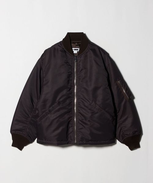 イタリアの高級合繊メーカー「OLMETEX」社のナイロンツイル生地で仕立てたフライトジャケットです。「MA-1」をベースに、接ぎの無い丸編リブやアームポケットなどの伝統的なディテールはそのままに、都会的でモダンな雰囲気にアレンジしました。ナイロン繊維の質や仕上げ技術の高さにより、高密度で肉厚な作りでありながら、柔らかく上品でラグジュアリーな仕上がりが魅力です。イタリアメーカー「RACCAGNI」社製のファスナーを採用し、適度なオーバーサイズ感、リブの詰まり具合などの洗練されたバランスが、ファッションムードを高めてくれます。