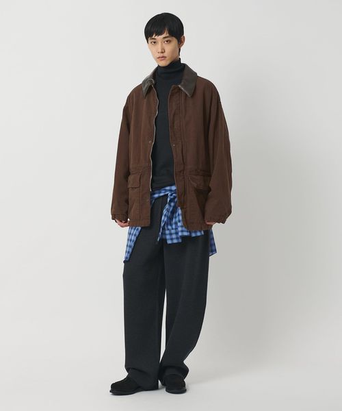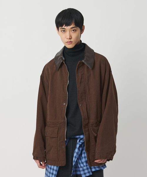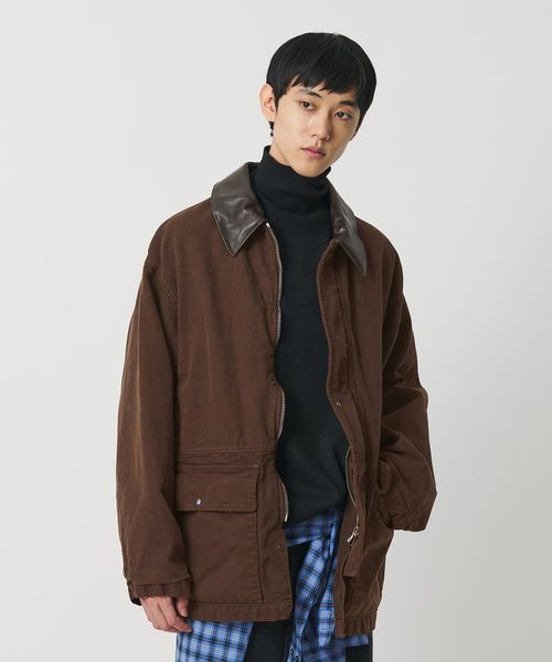 ヨーロッパヴィンテージのハンティングジャケットをベースに、都会的なムードでアレンジしたカバーオールです。高密度のダック生地を使用し、あえてムラの少ない糸で織り上げることでカジュアル感を和らげながら、ポケット形状などのディテールは直線的に作ることで、ワーク感の薄れたモードな印象に。ブラウンに染めた後にブラックの顔料をのせ、洗いをかけることで、顔料が退色しヴィンテージのような表情に仕上がっています。ステッチカラーも微配色に設定し、さりげなくも奥行を引き立てる豊かな表情を演出。オーバーサイズのボディに、取り外し可能な襟はトルコ産のシープレザーを贅沢に使用し、着映えと着回しを両立する万能なアイテム。重厚感のある佇まいが特別なムードを醸し出し、見た目に反した軽やかな着心地が、気負わず袖を通せるオールマイティーな一着。