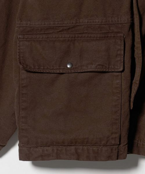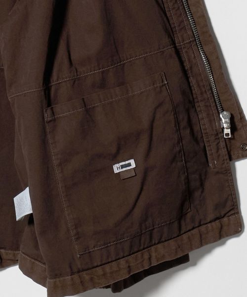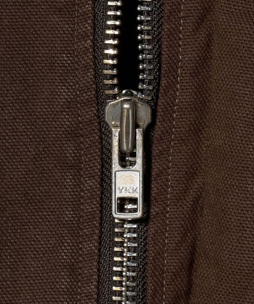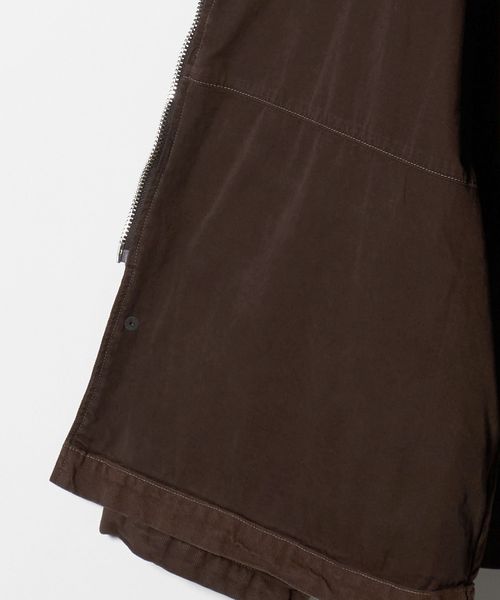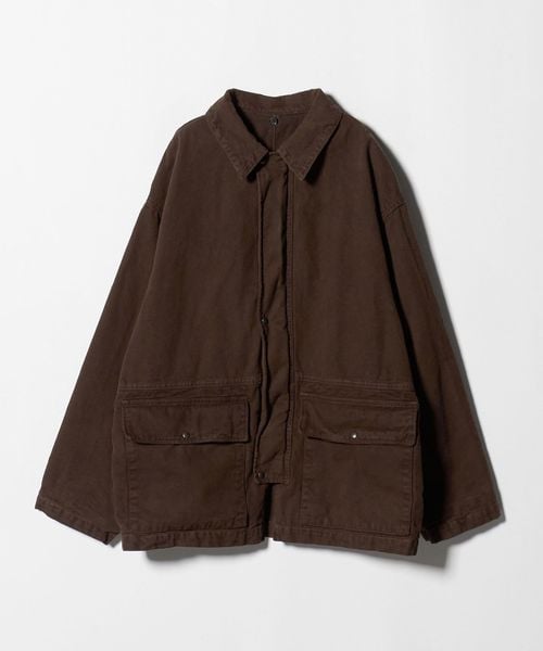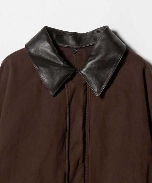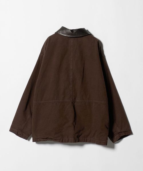 ヨーロッパヴィンテージのハンティングジャケットをベースに、都会的なムードでアレンジしたカバーオールです。高密度のダック生地を使用し、あえてムラの少ない糸で織り上げることでカジュアル感を和らげながら、ポケット形状などのディテールは直線的に作ることで、ワーク感の薄れたモードな印象に。ブラウンに染めた後にブラックの顔料をのせ、洗いをかけることで、顔料が退色しヴィンテージのような表情に仕上がっています。ステッチカラーも微配色に設定し、さりげなくも奥行を引き立てる豊かな表情を演出。オーバーサイズのボディに、取り外し可能な襟はトルコ産のシープレザーを贅沢に使用し、着映えと着回しを両立する万能なアイテム。重厚感のある佇まいが特別なムードを醸し出し、見た目に反した軽やかな着心地が、気負わず袖を通せるオールマイティーな一着。